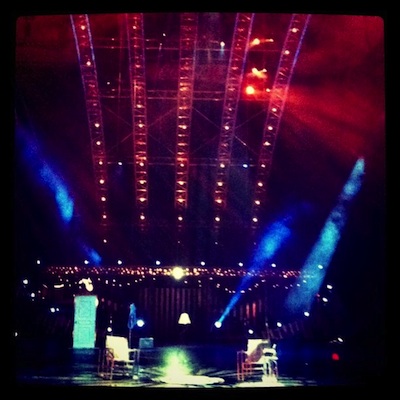 The show opened Wednesday night at the Long Beach Convention Center. Here’s a look at the stage (below), or canvas if you will, where the story unfolded. Note the five multitracks overhead, which is where performers seemingly free floated above, often in long, draping cloth surreal-wear.
