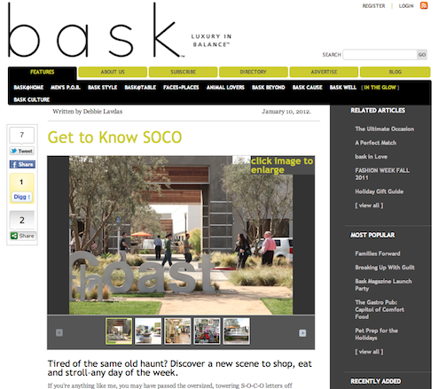 My story here on SoCo in the Winter issue of bask Magazine… If you’re anything like me, you may have passed the oversized, towering S-O-C-O letters off the 405 countless times and heard buzz of the place from your stylish friends, but something still stopped you from exiting the 405 near the South Coast District to check it out. Could the four or more stores visible to the eye really be worth your time? And why go—what exactly is the place? Click to read the full story in the current bask Magazine.