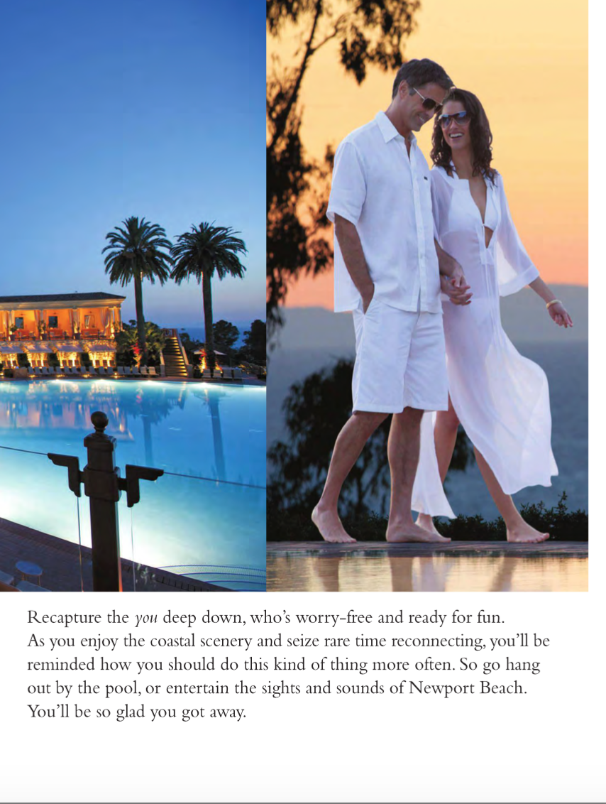 “Leave it all behind. You can’t buy time, but here, you can almost make it stand still. Recapture the you deep down, who’s worry-free and ready for fun. As you enjoy the coastal scenery and seize rare time spent reconnecting, you’ll be reminded how you should do this kind of thing more often. So go hang out by the pool, or entertain the sights and sounds of Newport Beach. You’ll be so glad you got away.”