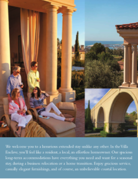 We welcome you to a luxurious extended stay unlike any other. In the Villa Enclave, you’ll fee like a resident, a local, an effortless homeowner. Our spacious long-term accommodations have everything you need and want for a special stay, during a business relocation or a home transition. Enjoy gracious service, casually elegant furniture, and of course, and an unbelievable coastal location.”